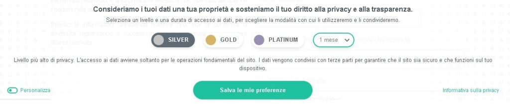 - Platinum: prevede l’installazione di cookie tecnici necessari e di funzionalità, di cookie analitici, nonché di cookie di profilazione: